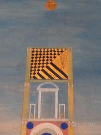 Un suggestivo dipinto metafisico, dal soggetto architettonico veneziano, molto decorativo, olio su tela con inserti in foglia d’oro zecchino, dai toni pastello.