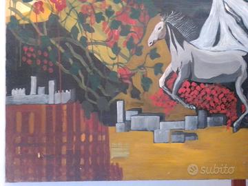 Suggestivo dipinto metafisico degli anni 1970, con elementi architettonici, un cavallo in corsa e una testa di manichino. Il quadro, realizzato olio su tela, risulta molto arredativo. Il dipinto è degli anni 1970.