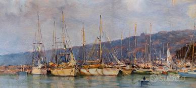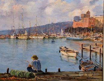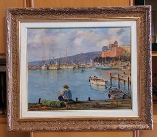 Dipinto olio di Antonio D'URSO 1934-2015. "Mergellina con pescatore " bellissimo dipinto olio su tavoletta di questo eccezionale artista paesaggista. Il dipinto è praticamente perfetto, colori, prospettiva e disegno calibrati al millimetro . Le misure sono 40x50 e con la bellissima cornice in legno e foglia oro 57x67.