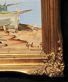 Piccolo dipinto a olio su masonite raffigurante una scena marina con barche da pesca e architetture costiere sullo sfondo, eseguito con pennellata materica e vivace