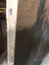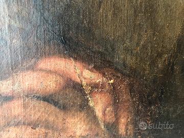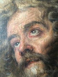 Dipinto olio su tela, epoca pieno 600, autore anonimo di area bolognese, opera da leggero restauro, rappresenta una testa virile in preghiera, misure 36.5 x 43.5 Spedizione possibile.