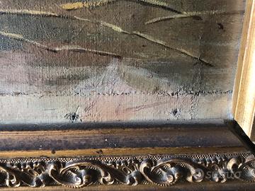 Dipinto olio su tela, firmato in basso a destra ( firma non leggibile ) epoca fine 800, rappresenta una giovane contadina mentre accudisce i suoi animali da cortile, opera in buone condizioni generali ( lievi cadute di colore ) misure 37 x 25 cornice 37 x 49 x 3.5 spedizione possibile.