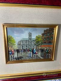 Dipinto in olio su tela Luciano LUTRING soggetto Parigi, firmato e autenticato . ORIGINE Italia, PERIODO 1995 AUTORE Luciano LUTRING (1937 - 2013) è stato un criminale, scrittore e pittore italiano. Luciano Lutring nasce a Milano da Elvira Minotti e Ignazio Lutring e passa la sua infanzia nel milanese, sotto la guida dei genitori che volevano fare di lui un violinista. Ben presto manifesta però la sua natura ribelle e il suo amore per le belle donne e per la bella vita. Attratto dal mondo della malavita, compra da un conoscente la sua prima pistola, una Smith & Wesson della polizia canadese, senza pallottole in quanto non erano più in commercio; da quel momento in poi il giovane Lutring acquisterà il soprannome de l'Americano. La sua fama nasce nella Milano degli anni sessanta. Soprannominato "Il solista del mitra" per la sua usanza di nascondere il fucile mitragliatore nella custodia di un violino, conclude centinaia di rapine fra Italia e Francia, per un bottino totale, da lui stimato, attorno ai trenta miliardi di lire dell'epoca. ... Da quel momento inizia la sua carriera di fuorilegge, fatta di remunerative rapine in molte banche e negozi, compiendone più di cinquecento. La figura di Lutring diviene leggendaria, assieme al suo stile di vita di latitante... Il 1º settembre 1965 viene infine ferito e arrestato a Parigi; sconta in Francia 12 anni di carcere (la condanna iniziale era a 22 anni), durante i quali inizia a scrivere e dipingere; tiene persino una corrispondenza con l'allora Presidente della Camera Sandro Pertini. Nel 1966, con la regia di Carlo Lizzani, esce un film ispirato alla biografia di Lutring, dal titolo Svegliati e uccidi, interpretato da Robert Hoffmann, Lisa Gastoni e Gian Maria Volonté. Graziato dal Presidente della Repubblica francese Georges Pompidou, torna in patria, dove viene nuovamente graziato dal Presidente Leone.