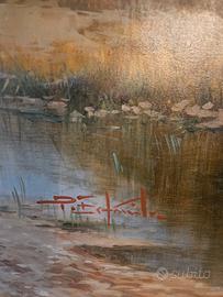 Bellissimo dipinto a olio su tela del maestro Pasquale Esposito, noto pittore della scuola napoletana del XX secolo. L’opera raffigura un suggestivo paesaggio fluviale con casolare al tramonto, realizzato con grande maestria tecnica e cromatica.