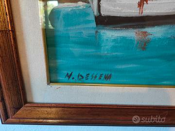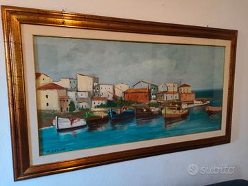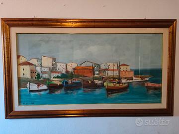 Splendido dipinto ad olio Veduta di Stintino, misura 60x120 cm. la tela con la cornice in totale 81,5X141,5 cm. cornice compresa nel prezzo, del famoso Pittore Sassarese Mario Dessena, dipinto nei primi anni 90, solo ritiro a domicilio senza ulteriori spese visto la grandezza del dipinto