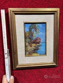 Dipinto olio su legno, dipinto periodo metà 900 dipinto di un paesaggio con Campanile, pittura centro Italia di tecnica ad olio molto rarefatta stile paesaggistica di fine ottocento periodo romantico, il dipinto misura 16x9cm, non ci sono firme, passepartout cornice in legno dorato con alloggio cornice 28x22cm, spedizione professionale con cartone ondulato polistirolo, ben imballato altre info e altre foto tel e w. 3314808197