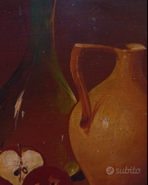 dipinto olio su masonite Salvatore Langella (XX) - Natura morta con mele bottiglia e brocca.Seconda metà del 900. Firmato in basso a sinistra: "S. Langella" Dimensioni dipinto: 30,0x24,0 cm Dimensioni cornice: 46,0x40,0 cm Con cornice - senza vetro Dipinto in ottime condizioni; piccolissimi difetti e segni del tempo; restauri al passepartout e piccoli difetti alla cornice (si vedano le foto) Pittore contemporaneo italiano noto per le sue straordinarie opere d'arte che fondono la tradizione classica con una sensibilità moderna. Nato nel cuore della Campania, Langella ha coltivato la sua passione per l'arte, ispirato dalla ricchezza culturale e artistica della sua regione natale. Dopo aver studiato presso accademie d'arte rinomate, Langella ha sviluppato uno stile distintivo che mescola abilmente tecniche tradizionali con una visione contemporanea. Le sue opere spaziano dalla pittura paesaggistica alla natura morta, dalla ritrattistica alla pittura astratta, dimostrando una versatilità artistica straordinaria. Langella ha esposto le sue opere in numerose mostre e gallerie d'arte in Italia e all'estero, guadagnandosi elogi e ammirazione per la sua maestria tecnica e la sua capacità di catturare l'essenza della bellezza in ogni forma. La sua influenza nell'ambito artistico contemporaneo continua a crescere, mentre le sue opere continuano a ispirare e affascinare gli amanti dell'arte in tutto il mondo. Lo stile di Salvatore Langella nelle sue nature morte sembrerebbe tendere all’Iperrealismo. Si nota, infatti, una volontà del pittore di riportare sulla tela oggettivamente, con fredda lucidità, i dati sensibili che ha di fronte agli occhi e ricorda la pittura fiamminga, nella precisione con cui riproduce i vari materiali e gli effetti della luce incidente su di essi.