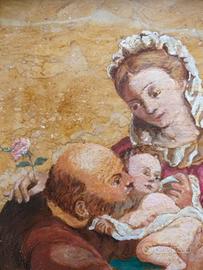Splendido dipinto ad olio su marmo, raffigurante Sacra Famiglia.
