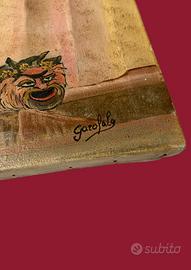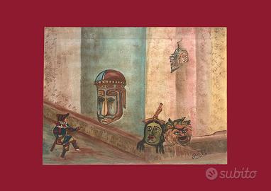 L’opera raffigura una composizione di gusto teatrale o fantastico, con maschere antropomorfe e un personaggio in costume che ricorda la tradizione del teatro dei pupi o delle maschere popolari. Il dipinto presenta elementi che richiamano diverse tradizioni artistiche e artigianali italiane. La presenza di maschere e di un personaggio in costume (simile a un cavaliere o a una figura del folclore) suggerisce un’ispirazione legata al mondo della scenografia teatrale o delle arti popolari. La tecnica e la composizione, con maschere fluttuanti e quinte architettoniche stilizzate, mostrano affinità con il surrealismo metafisico o con opere di artisti del XX secolo che hanno esplorato il tema della maschera come rappresentazione introspettiva. Il nome “Garofalo” potrebbe riferirsi a un artista locale o contemporaneo che opera nel solco della pittura figurativa o delle tradizioni popolari, come accade spesso in botteghe specializzate in scenografie o decorazioni di ispirazione storica. Dettagli Autore: Garofalo Anno: ? Tecnica: olio e acrilico su tela Dimensioni: 30 x 40 cm. Ritiro a mano gratuito.