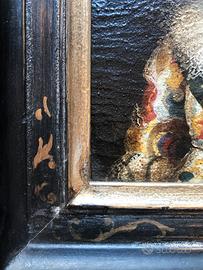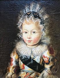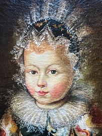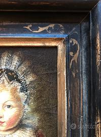 Dipinto raffigurante un bambino di ispirazione fiamminga, proveniente dalla scuola olandese. Epoca: seconda metà del XX secolo Dimensioni: 20x25 cm (tela) 31x35 cm (con cornice)