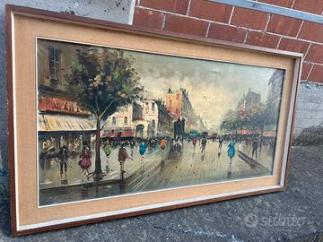 Dipinto della vecchia Parigi. L’autore , ( con firma da decifrare) segue la corrente post impressionista che tanti autori ha ammaliato nella metà del secolo scorso come De Vity, De Simone ecc