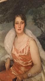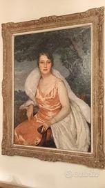 Per sgombero villa Liberty, vendo un grande dipinto ad olio su tela di Vittorio Gussoni, firmato e datato 1939: "Ritratto di gentildonna in un paesaggio". Il dipinto è stato professionalmente pulito. I colori giusti si vedono nell'ultima foto. Misura: h.cm 138 x 103 , cornice originale in legno intagliato.
