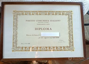 diploma rilasciato dalla segreteria di Milano del partito comunista italiano a comune milanese x il raggiungimento del quorum degli iscritti nell' anni 1976 . diploma a firma di Riccardo Terzi presidente della segreteria. rilasciato il 15.12.1975 a milano .