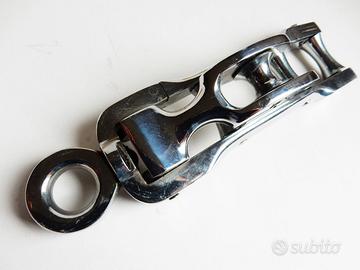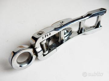 È realizzato in acciaio cromato con elementi mobili per l'inserimento della corda, misura cm 19 di lunghezza e pesa gr 500.