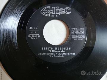 Disco vinile 45 giri EP (Extendet Play)Benito Musssolini I DISCORSI ", in ottimo stato di conservazione, con copertina originale in ottime condizioni. Prodotto dall'etichetta Edisc HI-FI. Contiene il celebre discorso del 7 dicembre 1935 intitolato "Le sanzioni" . Cimelio storico da collezione.