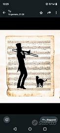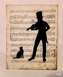 Set di disegni originali realizzati a china su vecchi spartiti musicali. Le illustrazioni raffigurano scene con musicisti e animali.