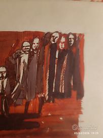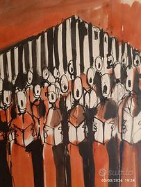 Vendo insieme due disegni, che sono con tutta probabilità studi/prove . Una rappresenta un coro in una grande chiesa o cattedrale, il secondo un cavallo che corre libero , con alcune persone sullo sfondo. Entrambe i disegni sono rappresentati in modo semplice , figure abbozzate,appena percepite , quasi tutte uguali e senza espressioni. Chissà quale può essere stata l idea dell autore, che tra l altro ha scelto un colore il rosso /marrone , il nero per la definizione delle forme ed il bianco, non colore , che aiuta meglio a percepire gli spazi, tutto rigorosamente realizzati con china e acquerello No danni ma qualche segno del tempo sulla carta, sono stati tenuto in una cartellina dagli anni 70 ad oggi 🍀Il prezzo è riferito alla coppia🍀.. Nessuna firma, purtroppo, dimensioni 51 x 35 ( per il coro ) 35 x 25 ( cavallo con personaggi ) che è però disegnato su carta delle stesse misure del primo ..Possibili ulteriori foto o video agli interessati,possibile visione e ritiro in loco,possibile , possibile spedizione a carico dell acquirente con tracciabilità. Si accetta pagamento solo tra le parti ho feedback qui ed in altri siti