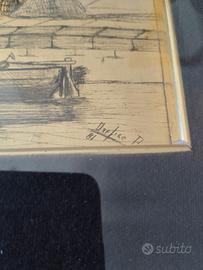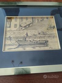 L'opera raffigura una scena di vita portuale o fluviale. Si vede una barca in primo piano, con delle persone a bordo e sulla banchina, e sullo sfondo si intravedono degli edifici. Questa piccola e affascinante opera originale ti porta indietro nel tempo. Realizzata nel 1981 dall'artista Orefice P., cattura la vita tranquilla di un porto o un fiume con un tratto di penna vivace e dettagliato. Un pezzo unico che aggiunge un tocco di autenticità e storia a ogni ambiente, perfetto per chi cerca un'opera d'arte non convenzionale con una storia da raccontare.