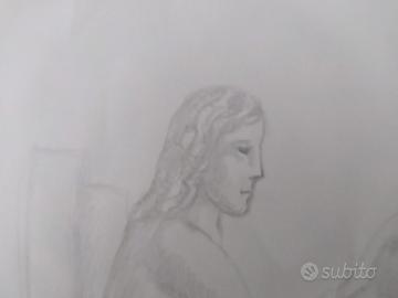 Disegno a matita raffigurante figura femminile seduta di profilo.
