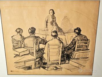 Disegno a matita su carta raffigurante una scena d’interno: cinque figure sedute, disposte in cerchio, osservano una donna in posizione centrale, probabilmente una lezione o un incontro.