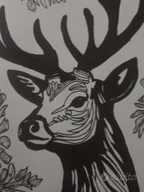 Opera realizzata a inchiostro nero raffigurante un cervo con grandi corna, decorato da motivi floreali dettagliati e circondato da elementi botanici.