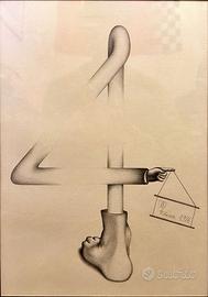 Proponiamo opera originale su carta, disegno a grafite datato 1976, realizzato da artista italiano non identificato, riconducibile all’ambito concettuale / surrealista degli anni Settanta.
