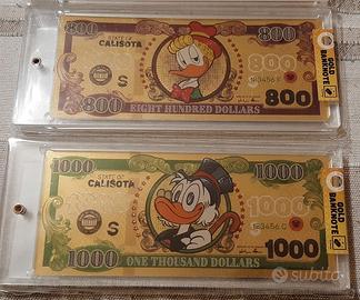 Banconote Disney raffiguranti sei tra i personaggi più rappresentativi dell'Universo Disney. Racchiuse in blister plastico trasparente con sigillo intatto, come da foto, ed inseriti in bustina di plastica trasparente per prevenire qualsiasi danno/graffio che potrebbe inficiarne lo stato. Più propenso a vendere il tutto in blocco, in unica soluzione, e non i pezzi singoli.