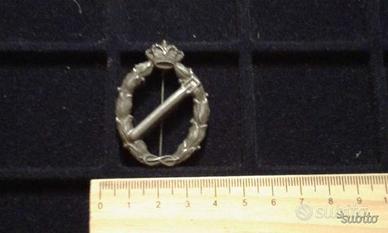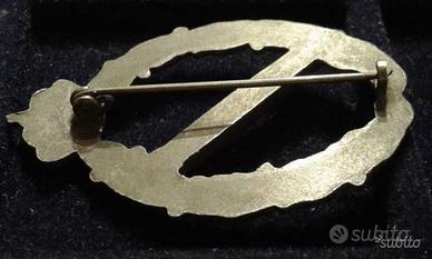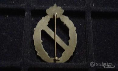 Cedo un bellissimo e particolare distintivo, nonchè molto raro (R2), per le azioni di volo in guerra degli equipaggi della Regia Aeronautica. Nel giugno del 1942, il Ministero dell'Aeronautica istituisce un particolare distintivo per il personale degli equipaggi di volo (piloti, osservatori e specialisti) che hanno partecipato ad effettive azioni della guerra in corso. si tratta di una serie di dieci distintivi a spilla, per le diverse specialità, da portare sul petto, con qualsiasi tipo di uniforme, sul lato sinistro della giubba, al centro della tasca superiore, composti da una cornice ovale con foglie di alloro dove domina la Corona Reale. Il distintivo si ispira chiaramente alla moda in uso alla Luftwaffe che utilizza tra il 1933 e il 1945 una vasta gamma di distintivi-premio. Sono realizzati in tre classi di merito : bronzo, argento e oro per segnalare il numero delle azioni di guerra in volo. La corona reale e la corona di alloro sono in metallo brunito mentre solo i simboli al centro variano nei tre metalli. Questo in esame è il tipo definito di "AEROSILURANTI" per la classe "ARGENTO" che veniva conferito per "10 siluramenti o l'affondamento di due unità nemiche". Le dimensioni sono 50mm x 35mm, lo spillone è perfettamente funzionante. Cimelio proveniente direttamente da aste, tutto "rigorosamente" originale d'epoca al 100% e garantito! Vengono postate alcune foto, per farne ammirare la bellezza, la particolarità. Inserzione indirizzata ad appassionati e collezionisti di materiale militare d'epoca, e' bandita ogni forma di ideologia politica o razziale. I visitatori dichiarano di essere interessati alla visione al solo scopo informativo storico e non di utilizzare il materiale a scopo propagandistico non in linea con le attuali leggi della repubblica italiana. Il pagamento per l'acquisto dell'oggetto, potrà essere effettuato a scelta del compratore tramite i seguenti sistemi: bonifico bancario, paypal, vaglia postale, carta di credito ricaricabile delle poste