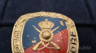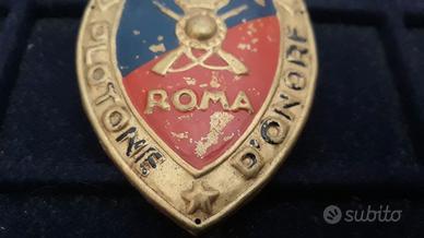 Eccezionale e rarissimo fregio o distintivo del Plotone d'Onore di Roma. Prima dell'istituzione della qualifica d'onore di "Squadrista" del 1939 e di altri distintivi particolari che testimoniavano la prestigiosa appartenenza alle prime formazioni fasciste vennero creati speciali reparti di appartenenza che raggruppavano i fascisti militanti nel partito ante Marcia su Roma.Tali gruppi erano formati da un numero ristretto di organizzatori selezionatissimi che presero vita all'interno dei Gruppi Rionali.Furono denominati secondo la consistenza Centuria, Vecchia guardia. scorta, plotone e vennero considerati speciali con posizione d'onore durante le cerimonie. Quando il gagliardetto esce dalla sede è scortato dall'alfiere e da 5 fascisti fra gli iscritti più anziani e più titolati, questo è appunto il plotone d'onore. Il fregio realizzato in alluminio bronzato e stampato reca l'emblema di fanteria coronato su campo bipartito blu e rosso e scritta ROMA, intorno la scritta PLOTONE D'ONORE e stella. Di estrema rarità. Le dimensioni sono 7cm x 6cm. Il pagamento per l'acquisto dell'oggetto, potrà essere effettuato a scelta del compratore tramite i seguenti sistemi: bonifico bancario, vaglia postale, ricarica delle poste, paypal (con aggiunta delle commissioni pari al 4%). Spedizione 7 euro (raccomandata). Diritto di recesso entro 10 giorni. Su richiesta dichiarazione di autenticità.