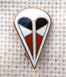 Raro e bel distintivo d’epoca nazista da berretto per “FALLSCHIRMJAGER” ovvero i “mitici” paracadutisti/incursori della LUFTWAFFE modello realizzato dalla ditta “BREGONZIO-MILANO” in smalti policromi e metallo argentato. Il cimelio in argomento, fu commissionato alla predetta impresa milanese per la fornitura in Germania ed è ancora completo della sua bustina originale di consegna marcata. Il distintivo, in particolare, reca disegnato sul dritto un paracadute con i colori del “TERZO REICH” ovvero “Nero-Bianco-Rosso” su uno sfondo completamente bianco, mentre sul verso è presente il bagno d’argento con cui sono rifiniti anche i bordi dei disegni sul dritto. Questo piccolo distintivo, fu motivo di grande “vanto” fra i paracadutisti tedeschi, che non perdevano occasione per sfoggiarlo e così distinguersi dal resto dell’aeronautica nazista. Ne veniva spesso fatto un uso “smisurato” anche sugli abiti civili. Il distintivo si presenta in "ECCELLENTI" condizioni di conservazione, ancora in “rigorosa” patina d’epoca e non presenta rotture, mancanze e/o difetto alcuno. Misure: distintivo = 25,8 mm x 16,5 mm; bustina di consegna = 68 mm x 35 mm.