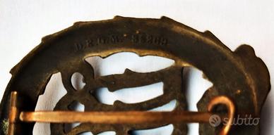 Interessante distintivo tedesco nazista cosiddetto "Deutsches Reichssportabzeichen", cioè per "meriti sportivi", trattasi del modello in uso durante i primi anni del “Terzo Reich” e cioè “PRE-1935”, infatti a partire dal 1935 in poi, gli stessi furono differenziati con l’introduzione della svastica nel disegno originale. Il distintivo in argomento fu realizzato in bronzo, cioè di "terza classe" (gli stessi furono prodotti anche in altre due classi, "seconda" in argento e "prima" in oro), ed è marcato sul retro, con il nome dal suo produttore e con il codice "DRGM 86269", una "sorta" di matricola di controllo, assegnata ai fabbricanti di questi distintivi dal Terzo Reich. Il cimelio si presenta in condizioni "ottime" di conservazione, ancora in patina d'epoca e senza difetto e/o mancanza alcuna, con il suo spillone sul retro perfettamente funzionante per l'indosso. Le sue misure complessive sono: 48 mm x 38 mm.