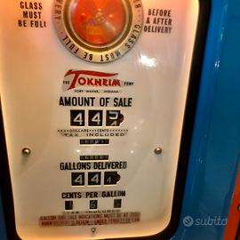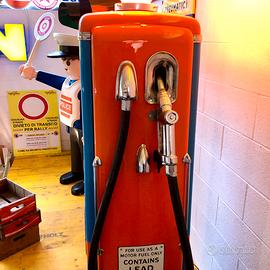 Come da titolo completamente restaurato e verniciato a polvere .Tutti gli elementi in metallo sono stati cromati . Le cifre numeriche ruotano e ad ogni giro suona il campanello. Globo originale in vetro , cosi come originale il tubo benzina e la pistola erogatrice. Interno a ripiani e porte apribili . Doppio fronte .