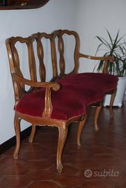 Grazioso divanetto inizi '900, in stile Chippendale, mis.60x175(l)x88h (altezza seduta 45cm) in legno con sedile imbottito e rivestito in velluto bordeaux. Ottime condizioni. Perfetto anche come divanetto in sala da attesa