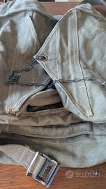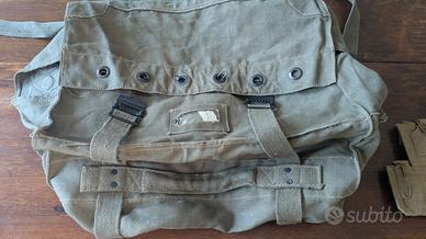 Divisa militare con camicia e pantalone, grande borsone e cimeli vari.