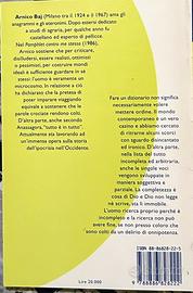 Il dizionarietto di sopravvivenza, 200 voci per non capire, è edito nel 1999 e scritto da Arnico Baj, che non è altro che lo pseudonimo usato in questo occasione da Enrico Baj il popolare pittore milanese. Scrittore nel suo stile divertente, arguto e futuristico il volume è nuovo, mai utilizzato con un disegno a mano in bianco e nero sulla prima pagina, ma non firmato.