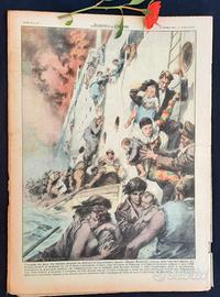 I drammi del mare. Un violento incendio ha distrutto il transatlantico inglese Empire-Windrush al largo delle coste dell'Algeria. Per fortuna proprio al momento in cui il fuoco e divampato, il mare, sino ad allora in tempesta, si è improvvisamente calmato e così i 1268 passeggeri, in gran parte militari che rimpatriavano con le famiglie dall'Estremo Oriente, e tutto l'equipaggio, meno 4 macchinisti, sono stati salvati. L'incendio è avvenuto all'alba quando ancora si stava svolgendo a bordo un ballo mascherato offerto dal comandante della nave, parecchie signore sono dovute perciò scendere nelle scialuppe in abito da sera o addirittura in maschera. (Disegno W. Molino)
