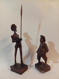 Vendo coppia sculture in legno intagliato raffiguranti Don Chisciotte e Sancho Panza, scolpite in un unico blocco di legno, con basetta scolpita a forma di libro circa cm 5 x 7 ciascuna, altezza Don Chisciotte 23 cm con la lancia 31 cm mentre Sancho Panza misura in altezza 17 cm.