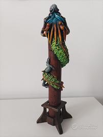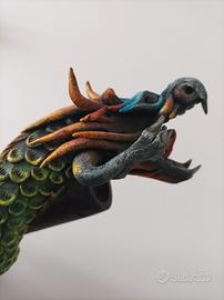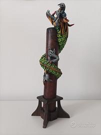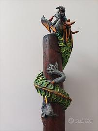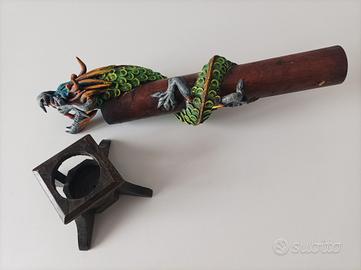 Splendido porta incenso verticale in legno con figura di drago in resina dipinta a mano, con base estraibile. Lavorazione artigianale thailandese. Grande dimensione (altezza circa cm. 41)