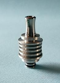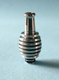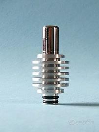 Drip Tip "Coolingtip" con radiatore di raffreddamento per abbassare la temperatura del vapore in uscita dall'atomizzatore per esaltare maggiormente l'aroma del liquido utilizzato. Indicato maggiormente per liquidi fruttati, vanigliati, liquorosi, Cannabis, ecc. Il Coolingtip marcato "DUKE DESIGN" e numerato sul fondo, è disegnato e prodotto interamente in Italia, ed è costituito da termodissipatore in alluminio anticorodal lavorato dal pieno e acciaio inox lucidato per la parte a contatto con la bocca, si monta su qualsiasi atomizzatore semplicemente inserendolo a pressione.