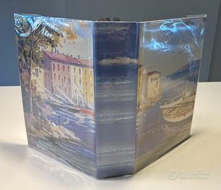 2 – Uno con copertina rigida, decorata a stampa con paesaggio marino. Sovracoperta protettiva in plastica trasparente - cm (15 x 22 x 5). Fascicolato internamente con 50 buste di cellophane, che contengono ciascuna un supporto di plastica, flessibile, zigrinata, di colore nero, che consente di inserire in ciascuna busta, le foto su entrambe le facciate. Quindi, le facciate utili per inserire le foto sono 100.