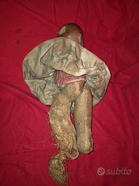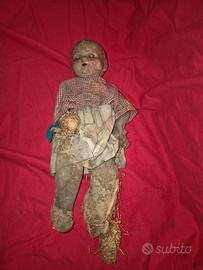 Bambole provenienti da un vecchio cascinale. Non sono un'esperto in merito e quindi propongo in vendita a quanto mi ha specificato il precedente possessore. Una, indubbiamente la più datata, pare primi 900, è imbottita di paglia compresi gli arti. Occhi azzurri funzionanti. Misura 35 cm. Da totale restauro; la paglia che forma uno dei piedini è fuoriuscita dalla parte in stoffa, senza capelli. La seconda bambola, alta 36 cm, ha gli occhi funzionanti, struttura sana, senza capelli. Sono oggetti antichi destinati in particolare ad appassionati e restauratori del genere.