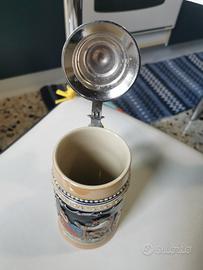 Due boccali di Birra vintage in ceramica con coperchio. Probabilmente di origine tedesca, con lavorazione bassorilievo, altezza 23 cm con coperchio. Ottime condizioni.