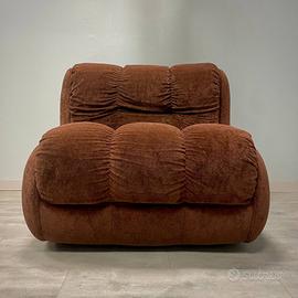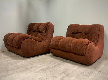 Coppia di poltrone da soggiorno realizzate negli anni 70 Design iconico e tipico del periodo. Struttura in legno, modellato con soffici imbottiture e rivestite di velluto marrone a trama asciugamano/moquette Sono di una comodità indescrivibile, sembra di sedersi su una nuvola! Stato di conservazione ottimo, tessuti e imbottiture praticamente perfetti, no strappi, no rotture o parti consumate/lise Le misure sono: H schienale 73 H sedile 44 larghezza 83 profondità 92 Spediamo su bancale in tutta Italia con imballaggio professionale a prova di corriere.