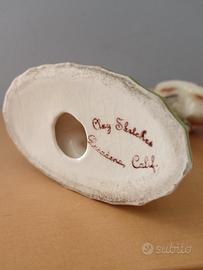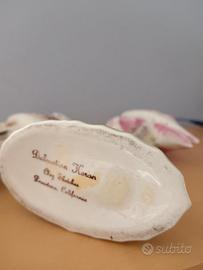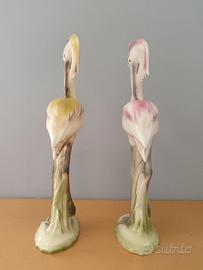 Una coppia di deliziose statuette da tavolo in ceramica invetriata, stile Art Decò americano, originali degli anni 1930-1940, marchiati a caldo sotto “Clay Sketches, Pasadena California”. I due fenicotteri, simbolo dell’Art Decò statunitense (luogo dove sono stati acquistati negli anni 1980), sono di identico disegno ma diverso colore. La loro conservazione è eccellente. Misure: 11 x 7 x H.18 cm