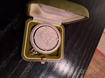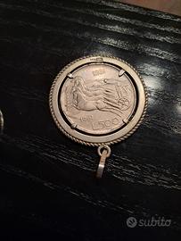 Due monete da 500 lire in argento, con cornice in argento 800. Una con caravelle, una del centenario.