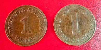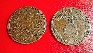 Due monete tedesche da 1 Pfennig, coniate in Germania, una nel 1909 e l'altra nel 1939, in ottime condizioni.
