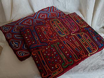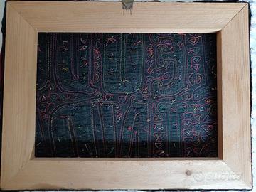 Una coppia di coloratissimi quadri, con applicata un modernissimo tessuto africano, dai colori brillanti e ricamo a rilievo. Due oggetti eleganti e adatti per ogni ambiente.