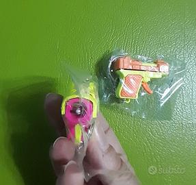 Set di due portachiavi vintage con pistola nei colori fluo rispettivamente fuxia/giallo e giallo/arancio, grilletto mobile.