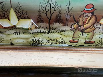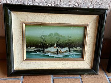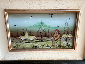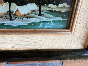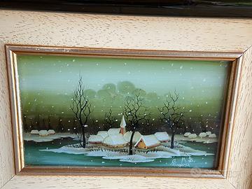 Due quadri naif dipinti a mano su vetro a rovescio, firmati. Misure : 14X24,5cm con cornice 28,5X39 cm.