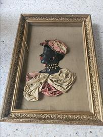 Due straordinari quadri, en pendant, probabile produzione francese, in cuoio, tessuto e pietre colorate, raffiguranti una donna e un uomo mori, abbigliati in modo aristocratico, realizzati tra la fine del 1800 e l’inizio del 1900, perfettamente conservati, recentemente restaurati e ripuliti. Due oggetti straordinari d’arredamento, originali e di bellissima fattura. I pannelli sono corredati di due belle cornici in legno, pastiglia con finitura a foglia oro. Misure: 62 x 84 cm Non si vendono separatamente. È richiesto il ritiro. Grazie
